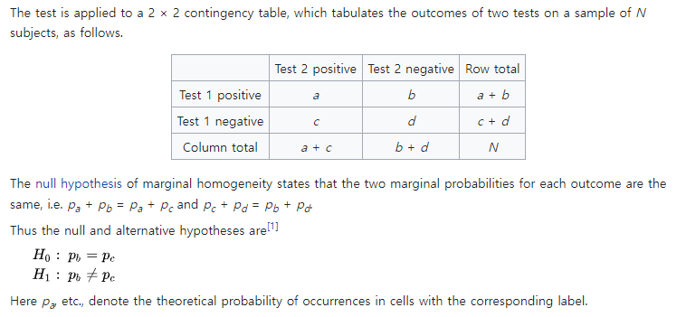 "test1에서 음성일 확률과 test2에서 음성일 확률이 같을까?" 라는 의미로 볼 수 있고,