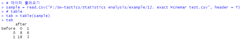 데이터는 이전 맥니마 검정때와 동일하지만, 표본 수만 줄였다.